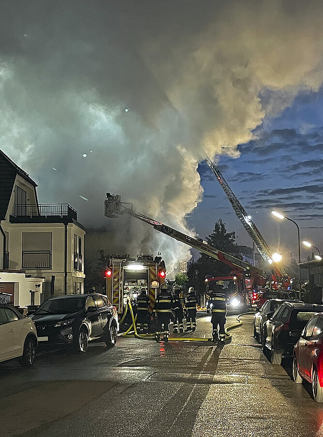 Am Mittwoch, 01.10.2025, gegen 04:40 Uhr, wurde die Feuerwehr über einen Brand in einem Wohnhaus in der Glockenblumenstraße (Lerchenau) verständigt. Wenig später gingen auch Hinweise auf Knallgeräusche beim Polizeinotruf ein. Die Polizei sperrte den Bereich daraufhin weiträumig ab.